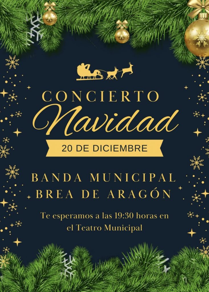 El sábado 20 de diciembre a las 19:30 horas se celebrará en el Teatro el concierto de Navidad de la banda municipal de Brea de Aragón. La entrada es libre hasta completar aforo.