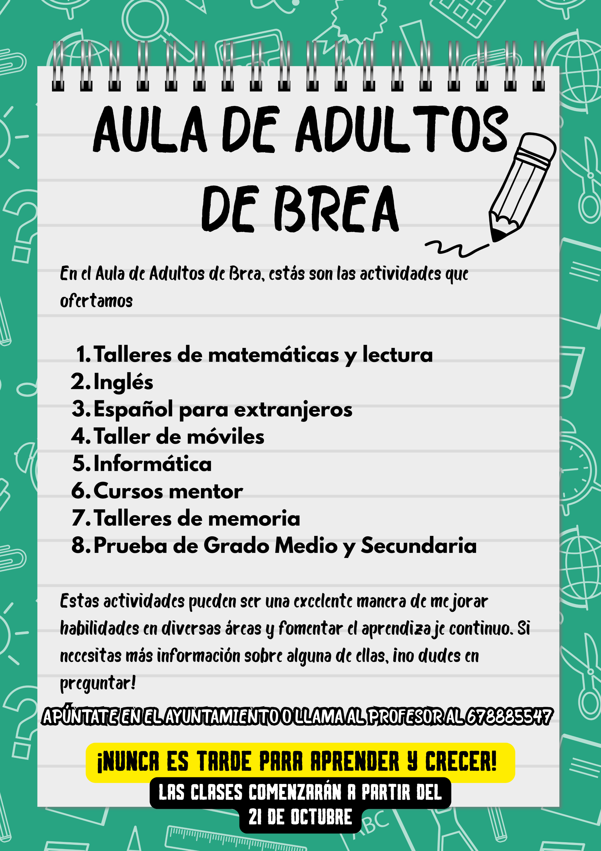 Se comunica a los interesados que está abierta la matrícula para la escuela de educación de adultos. Las clases se imparten en la Casa Cuartas. Mas información en el teléfono 678 88 55 47 o dirigiéndose a escuelaadultosbrea@gmail.com
