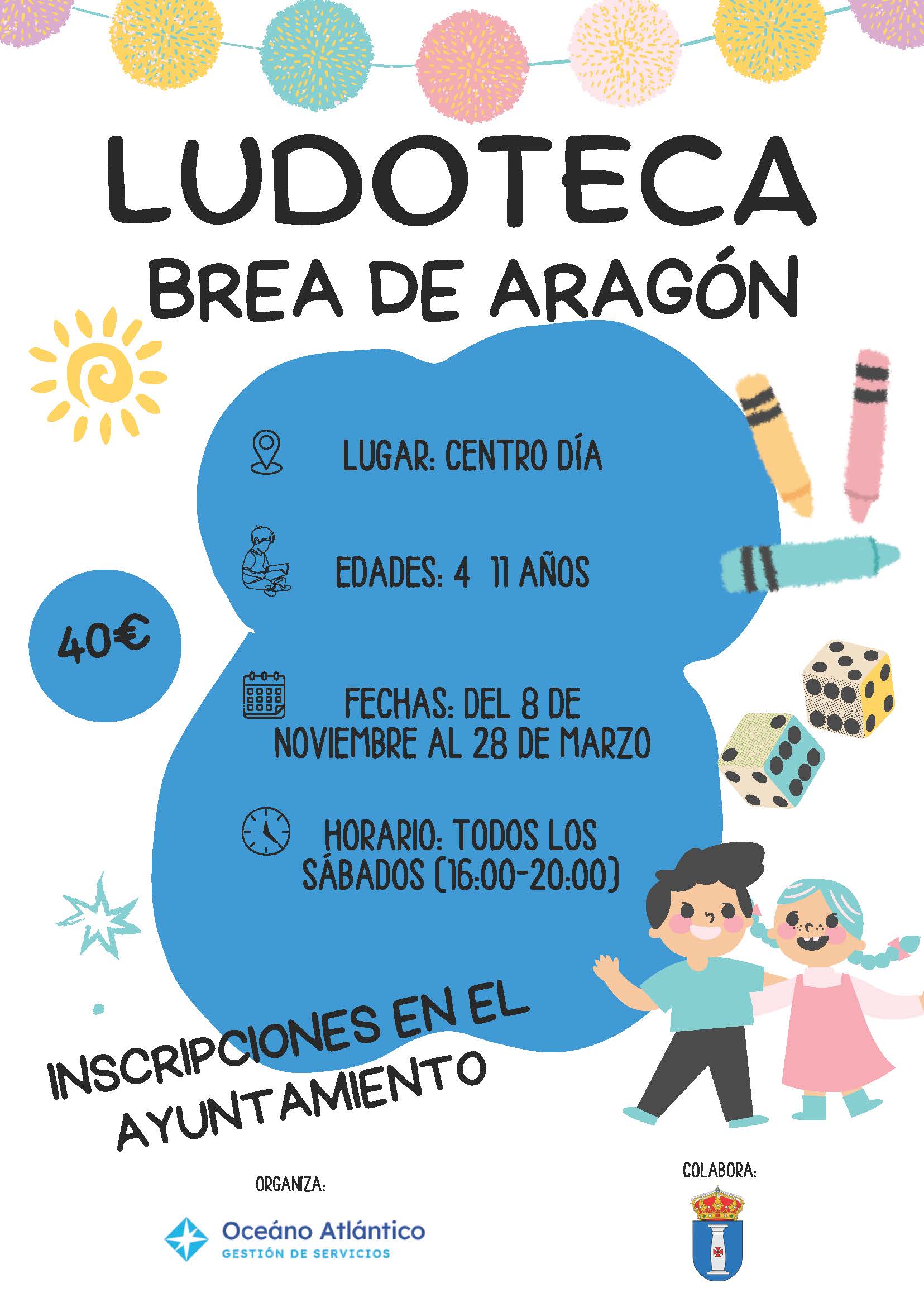 El sábado 8 de noviembre comenzará la ludoteca de invierno organizada por el Ayuntamiento de Brea de Aragón, realizándose en la planta baja del centro de día (entrada por el "molino"). Está dirigida a niños de 4 a 11 años. El precio por toda la temporada (sábados del 8 noviembre...