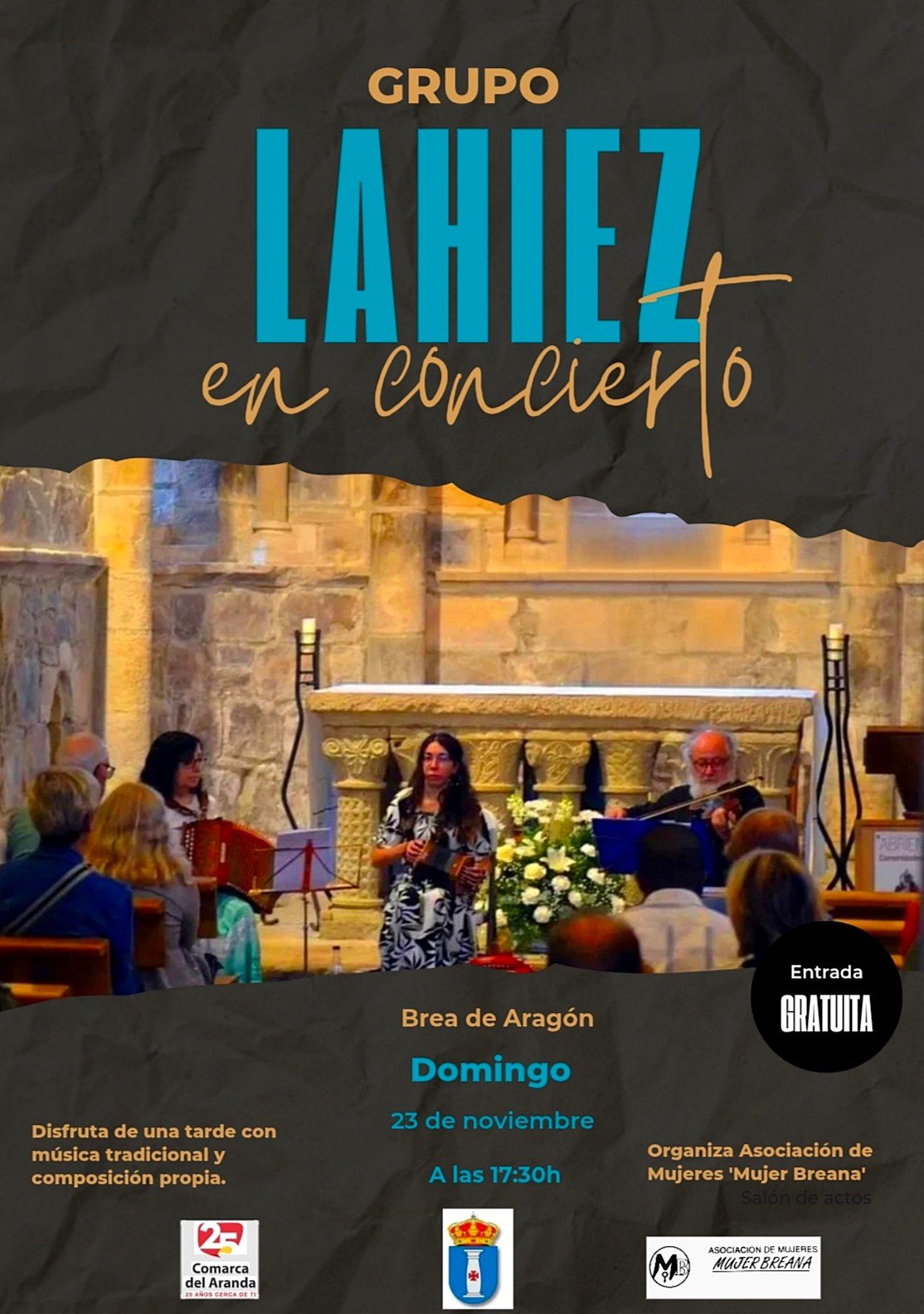 La Asociación de mujeres "Mujer Breana" ha organizado un concierto de música tradicional del grupo Lahiez el domingo 23 de noviembre a las 17:30 horas en el Cine Teatro. La entrada es gratuita hasta completar aforo.